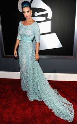 Feeling blue? I get that. The blue gown I LOVE. The blue hair? Not so much. Only Katy Perry could pull this off. |